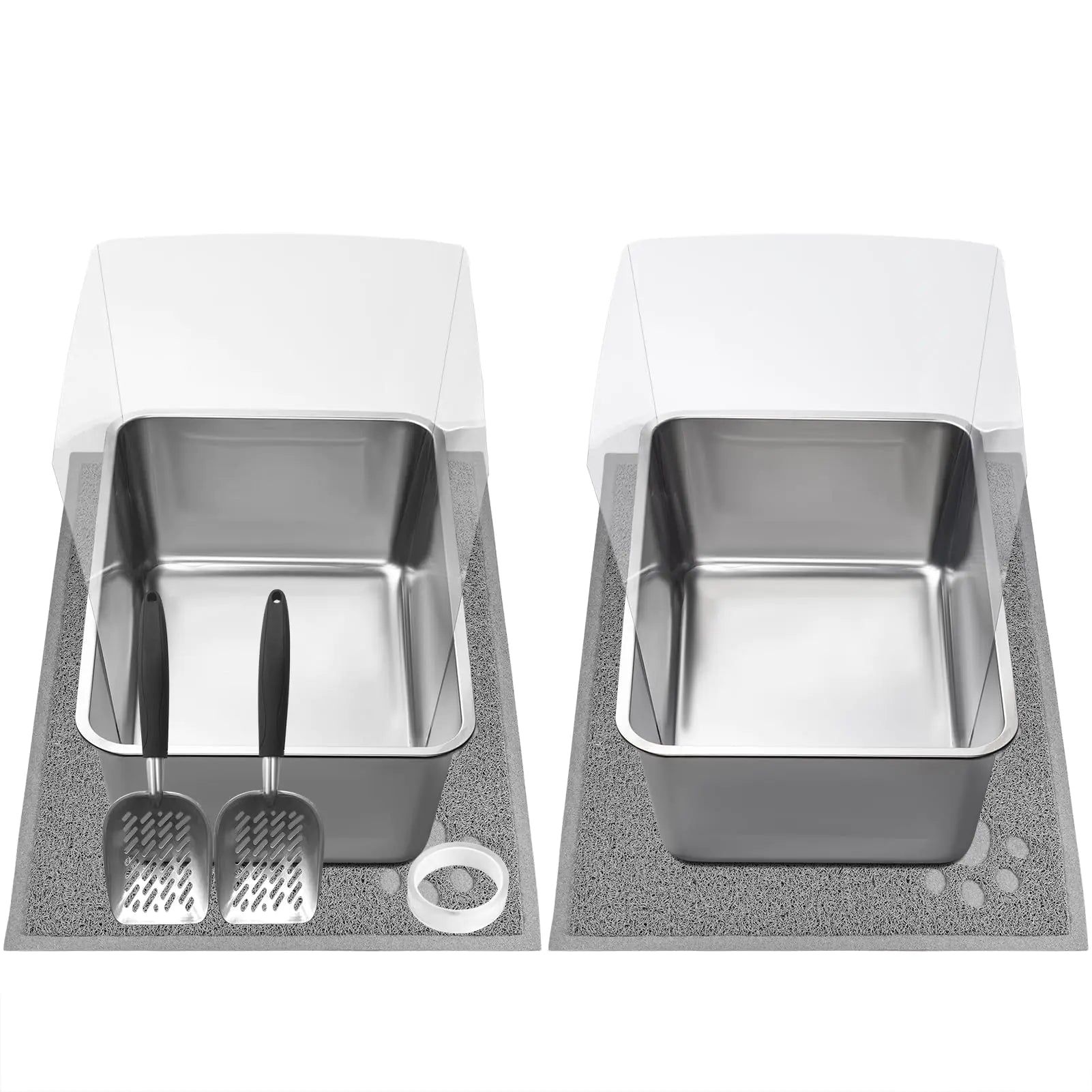 2 PCS Stainless Steel Cat Litter Box Extra Large Metal Litter Box with Plastic Shields Kitty Basic Litter Pan 23.6*15.8 with Metal Litter Scoopers Litter Mat