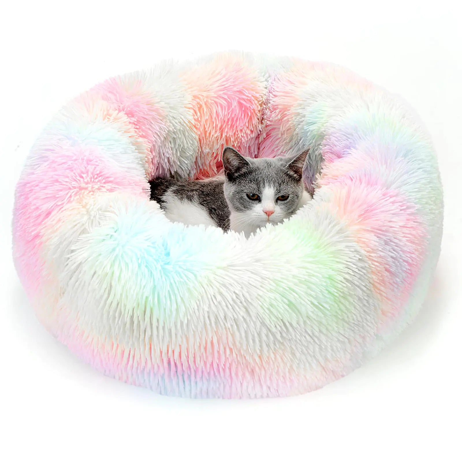 KSSDLSM Cat Dog Beds for Indoor Cats, Fluffy Round Removable Cat Bed,Waterproof Non-Slip Self-Heating Pet Bed (Large Rainbow)